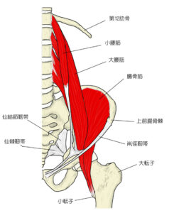 この筋肉が硬いと、反り腰になりやすく、腰が痛くなりやすいです。