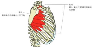前捻筋は、肩甲骨の裏から肋骨に向かってついている筋肉で、肩甲骨を安定させる役割をします。