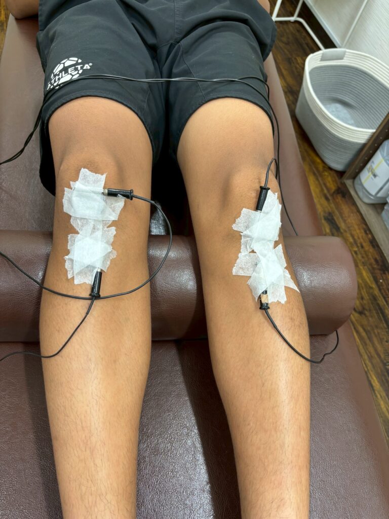 オスグッドは、大腿四頭筋を過度に使うことによって膝下の骨が引っ張られ、痛みや炎症が生じます。