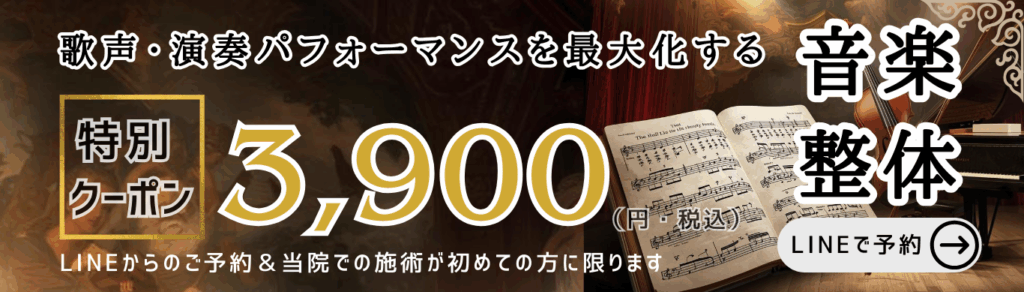 もし、このようなお悩みを抱えているなら、当院の【音楽家のための身体コンディショニング・音楽整体】をぜひ体験してください。身体のコンディションを整えることでパフォーマンスは確実に変わります。